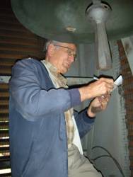 Unsere drei Glocken sind (übrigens in Abstimmung mit denen der Katholischen St. Bartholomäuskirche) auf die Töne e, g, a gestimmt. Mit diesen Tonstufen beginnen einige wichtige Kirchenlieder unseres Gesangbuches, z.B. das alte Tedeum "Herr, Gott, dich loben wir" oder das Adventslied "0 Heiland reiß die Himmel auf". Da gab es in der Glockenstube also doch einiges zu entdecken. Schwarz von Motorenölflecken, und von Spinnweben (noch mehr als ohnehin schon durchs Alter) ergraut, klettern wir befriedigt wieder die 50 Stufen hinab.